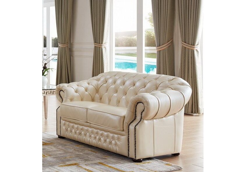 Обивка из натуральной кожи бежевого цвета. Диваны и кресло декорированы ромбовидной стяжкой "капитоне", подлокотники украшены декоративными гвоздями.
