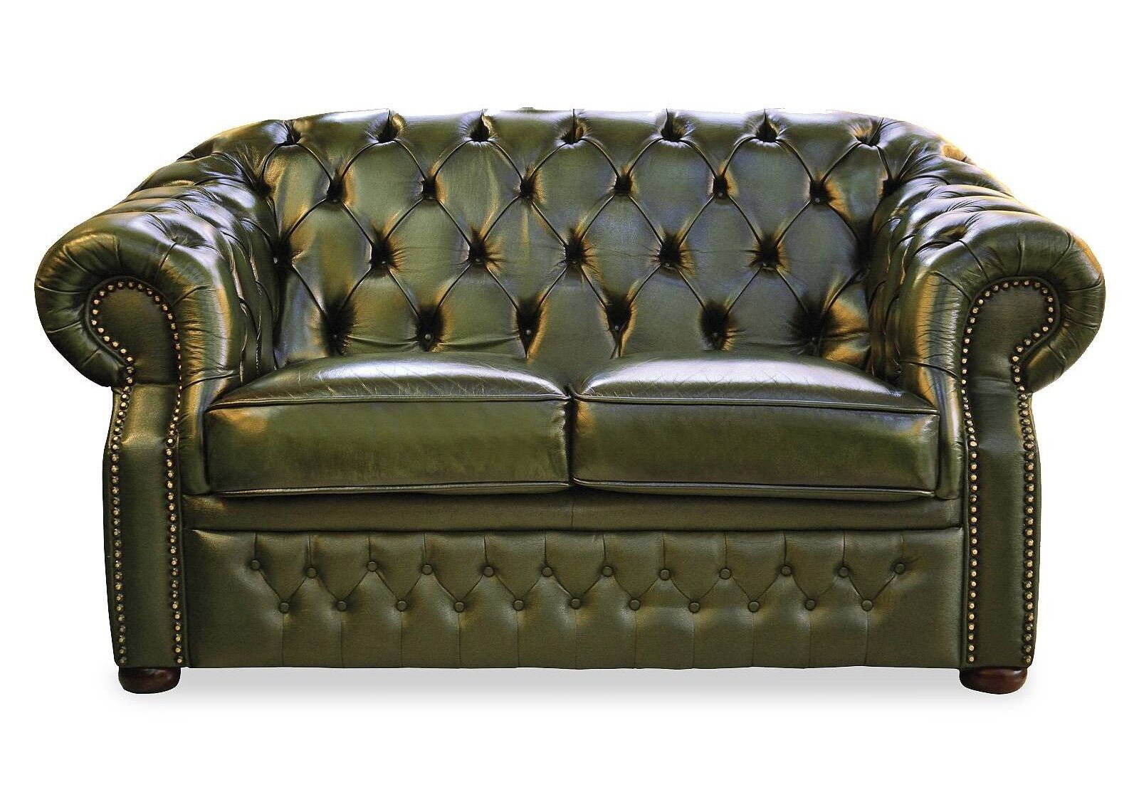 Диван B-128 (2-х местный). Обивка из натуральной кожи зелёного цвета. Диваны и кресло декорированы ромбовидной стяжкой "капитоне", подлокотники украшены декоративными гвоздями.