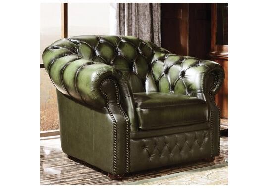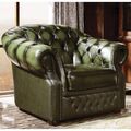 Кресло B-128. Обивка из натуральной кожи зелёного цвета. Диваны и кресло декорированы ромбовидной стяжкой "капитоне", подлокотники украшены декоративными гвоздями.