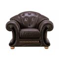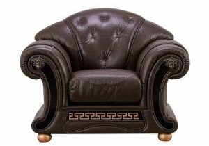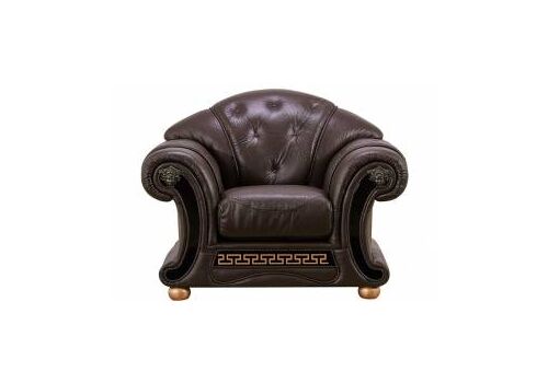 Роскошное кресло в стиле арт-деко. Обивка из натуральной кожи коричневого цвета. Декоративные пуговицы на спинке и подлокотниках. Геометрический орнамент "меандр" подчёркивает цвет ножек. Коллекция мягкой мебели Versace станет украшением Вашей гостиной, если Вы избрали для своего интерьера классический стиль или арт-деко.